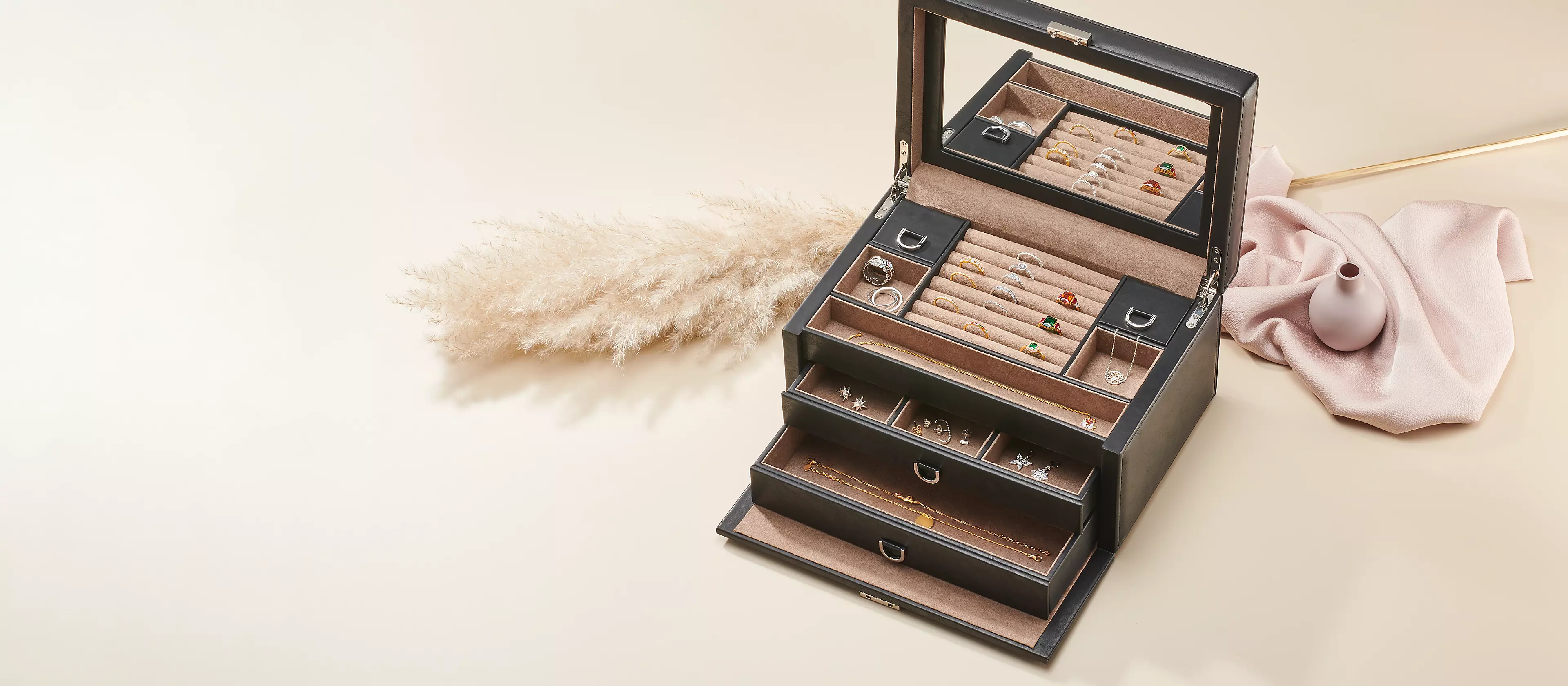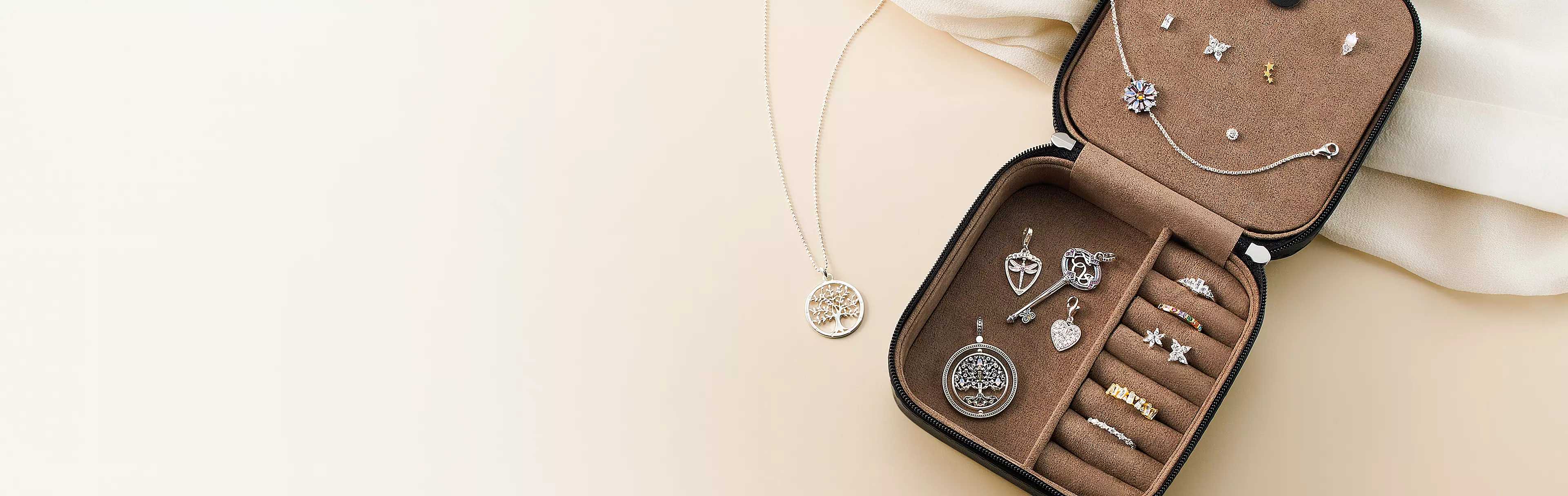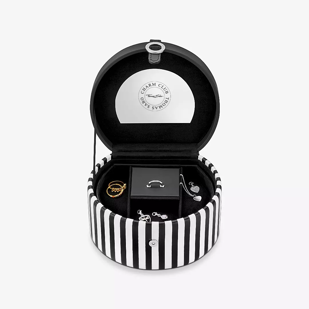 Nuestro joyero Charm Club convence con un llamativo diseño de rayas y un interior de gran calidad. Los anillos, collares, pendientes o pulseras se guardan siempre cuidadosamente aquí, ya sea en casa o de viaje.